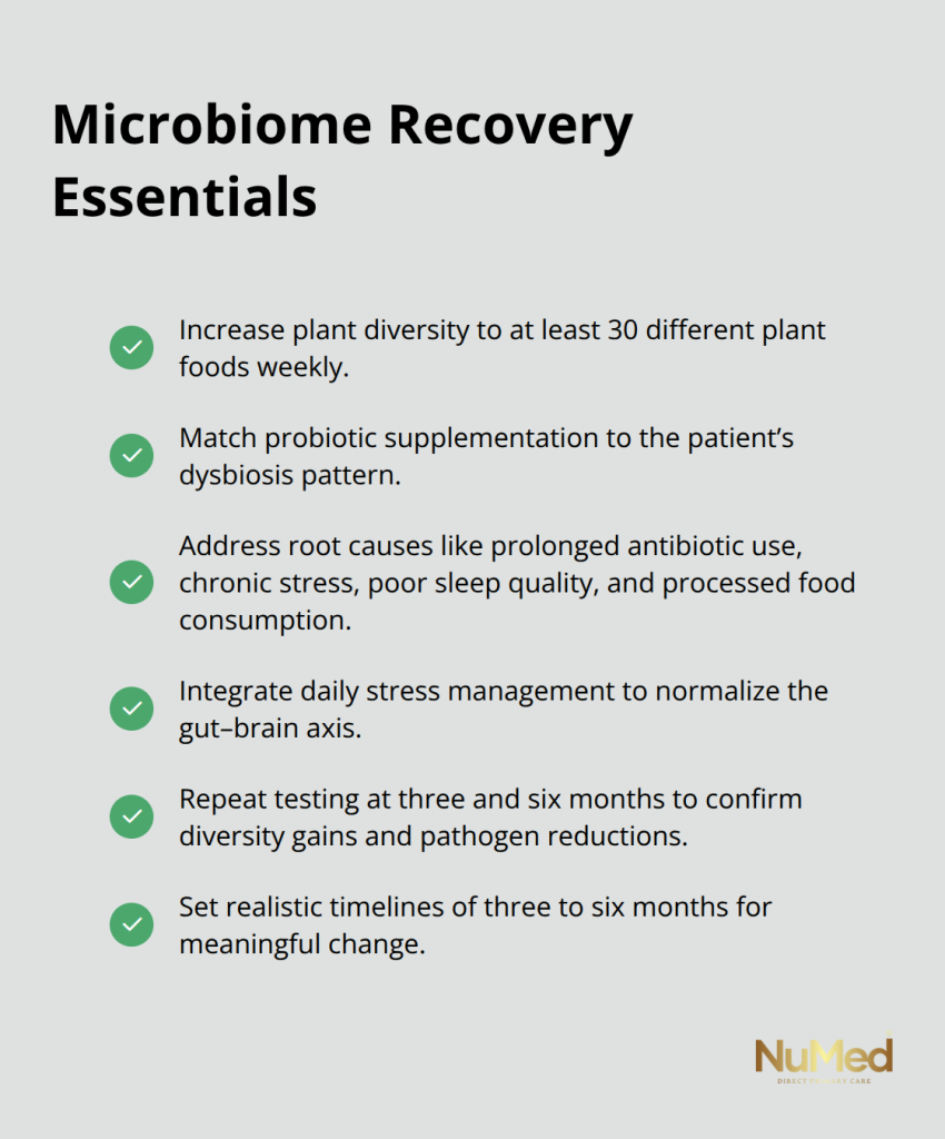 Microbiome rebalancing typically requires three to six months minimum because bacterial populations shift slowly. Practitioners who promise faster results oversell the pace of biological change. Effective protocols include dietary modifications that increase plant diversity to at least 30 different plant foods weekly, targeted probiotic supplementation matched to the patient’s dysbiosis pattern, and stress management because the gut-brain axis means cortisol dysregulation perpetuates dysbiosis regardless of dietary changes. Repeated testing at three and six months tracks whether microbial diversity improved and whether pathogenic bacteria decreased.