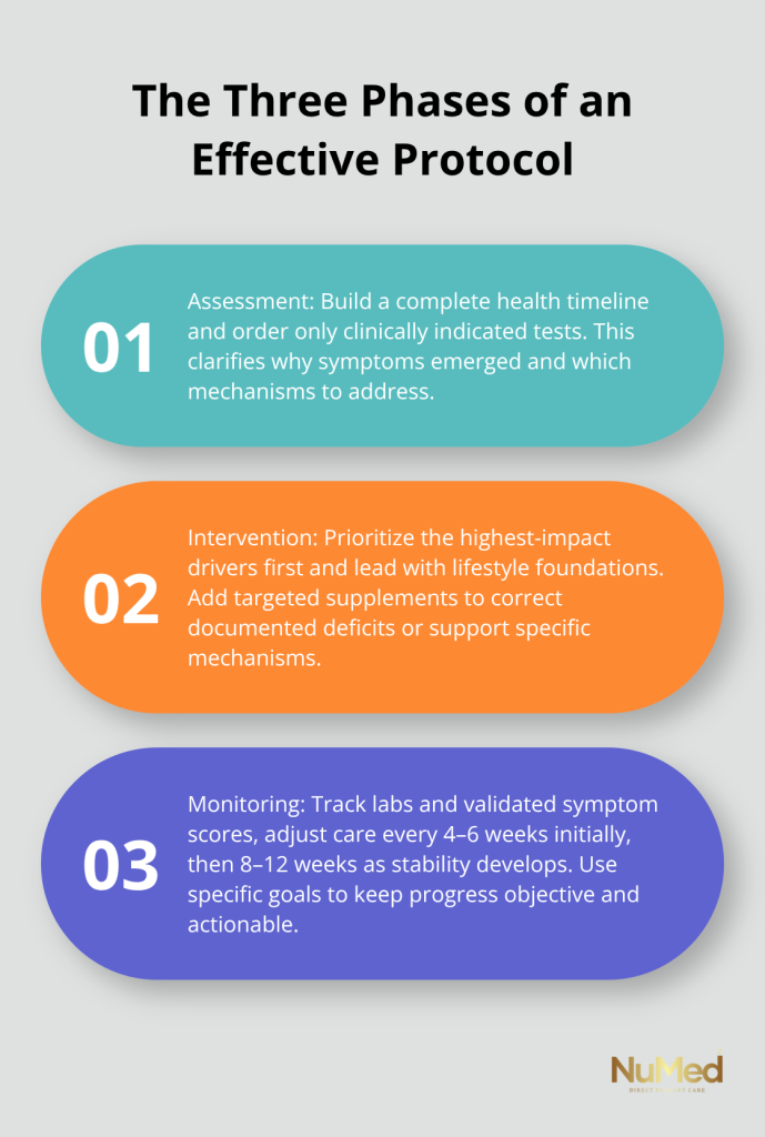 Building an effective functional medicine protocol requires three critical phases that most patients skip or rush through, which explains why they fail. The assessment phase determines everything downstream, and this is where most conventional practitioners fall short. Practitioners must spend substantial time gathering your complete health timeline, not just your current symptoms. This means understanding prenatal exposures, childhood infections, environmental toxins, dietary patterns across decades, stress history, sleep quality, relationships, and work satisfaction. The functional medicine timeline reveals patterns that explain your current state. A patient with autoimmune thyroiditis might discover that their condition emerged following a severe infection ten years ago, combined with chronic sleep deprivation from shift work, plus undiagnosed celiac disease that damaged their gut barrier. Standard testing would have flagged the thyroid antibodies. Functional assessment reveals why the autoimmune response was activated. This distinction transforms treatment.