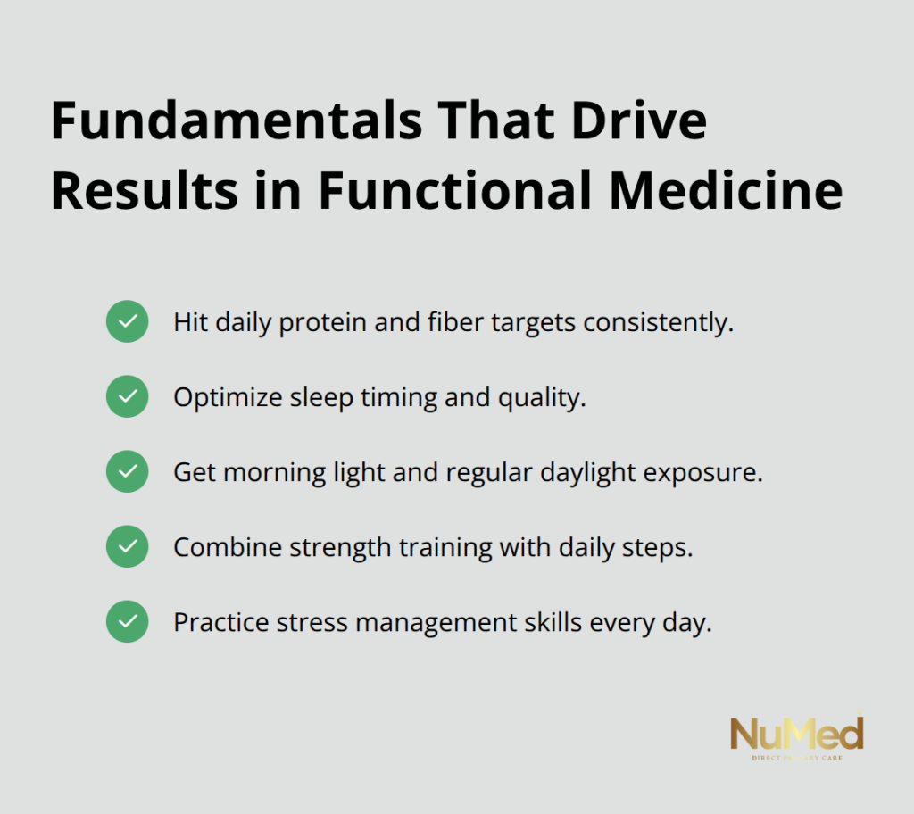 The timeline for results matters practically. Short-term gains typically emerge within the first 4 to 12 weeks and include better energy levels, steadier digestion, improved sleep quality, and more predictable daily functioning. Longer-term durable changes usually require 3 to 6 months or more, with the biggest returns coming from consistent implementation of fundamentals rather than expensive testing or supplement stacks. A functional medicine practitioner who focuses on protein and fiber targets, optimized sleep timing, light exposure, physical activity combining strength and steps, and stress management skills produces better outcomes than one who orders endless specialty labs without behavioral support.