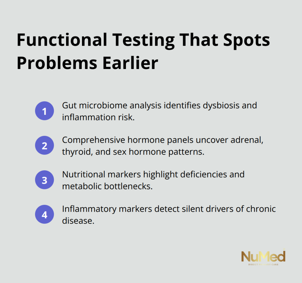 Conventional diagnostics rely on standard lab work like basic metabolic panels and cholesterol counts, which detect disease once it has already advanced. Functional medicine uses functional testing to identify imbalances before they become disease. Gut microbiome analysis, comprehensive hormone panels, nutritional markers, and inflammatory markers reveal dysfunction that standard labs ignore. You might have a normal cholesterol reading yet still have oxidative stress driving heart disease risk, something functional testing can uncover.
