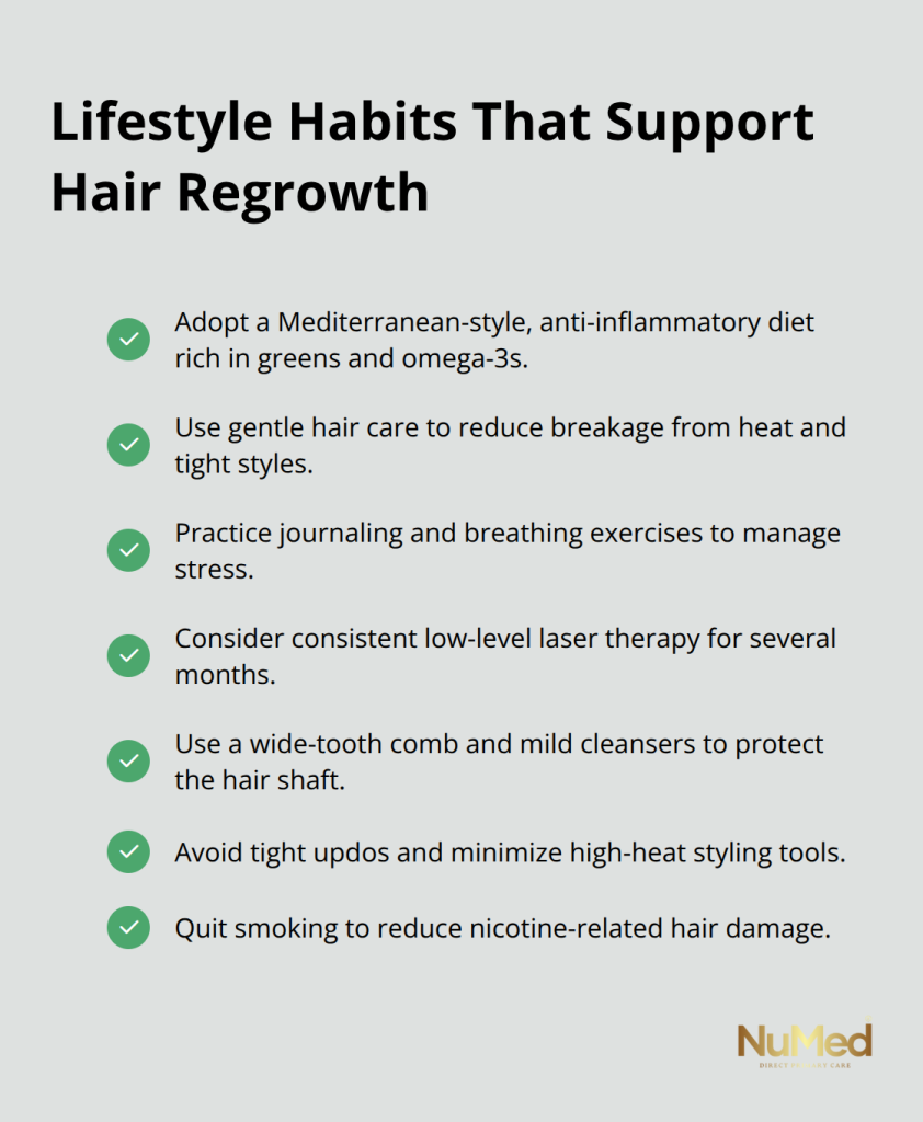 Scalp massage for just a few minutes daily increases hair thickness in some people after several months by improving nutrient delivery to follicles. Low-level laser therapy devices demonstrate modest improvements in hair density for androgenetic alopecia when used consistently for four to six months as part of a comprehensive plan. A Mediterranean-style anti-inflammatory diet emphasizing iron-rich greens, omega-3 foods like salmon and sardines, and colorful produce supports hair health far better than processed alternatives. Gentle hair care eliminates breakage that masks as loss, so minimize heat styling, avoid tight updos, use a wide-tooth comb, and choose mild cleansers. Stress management through journaling, breathing exercises, and mindfulness reduces cortisol disruption of your hair growth cycle. Smoking cessation directly improves hair health by reducing nicotine exposure linked to premature graying and loss, according to Harvard Health.