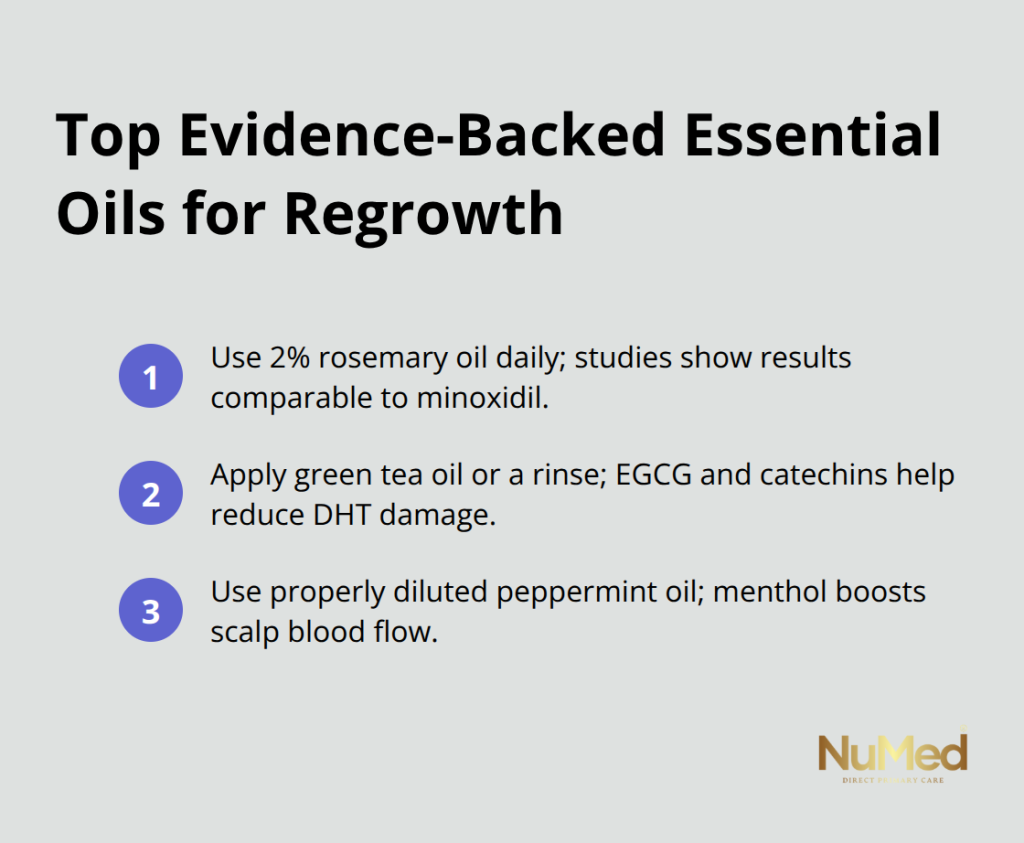 Rosemary oil stands apart because it performed as effectively as minoxidil in a randomized controlled trial by Panahi and colleagues published in 2015, making it one of the few natural remedies with direct clinical comparison to pharmaceutical standards. The mechanism works through improved scalp circulation and follicle stimulation, not through vague antioxidant benefits. Green tea oil containing EGCG and catechins reduces DHT-related follicle damage according to research in the Asian Journal of Pharmaceutical and Pharmacology, and the dose matters: one to two cups daily or a post-wash rinse delivers measurable catechin concentrations to your scalp. Geranium oil regulates sebum while providing amino acids directly to dermal papilla cells, supported by research in BMC Complementary and Alternative Medicine. Peppermint oil increases scalp blood flow through menthol-induced vasodilation, documented in Frontiers in Physiology, but concentration determines safety. These three oils separate from marketing noise because peer-reviewed journals like the BMJ and Toxicology Research published their efficacy data.