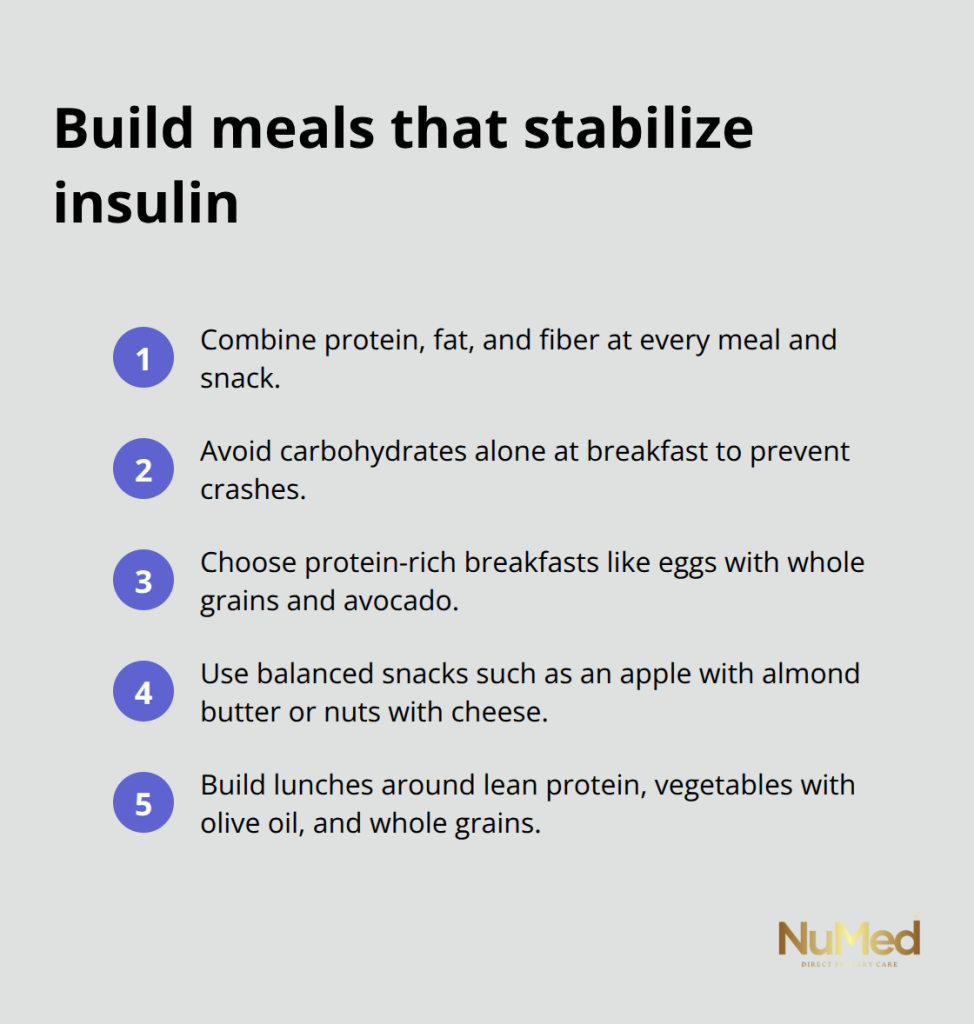 Insulin stability forms the foundation of hormonal balance, yet most people structure meals in ways that spike and crash blood sugar repeatedly throughout the day. Eating carbohydrates alone at breakfast sends insulin surging, which then plummets two hours later, triggering fatigue, cravings, and stress hormone release to compensate. This pattern destroys hormone balance in nearly every patient who hasn’t addressed meal composition. The fix is mechanical: combine protein, fat, and fiber at every meal and significant snack.