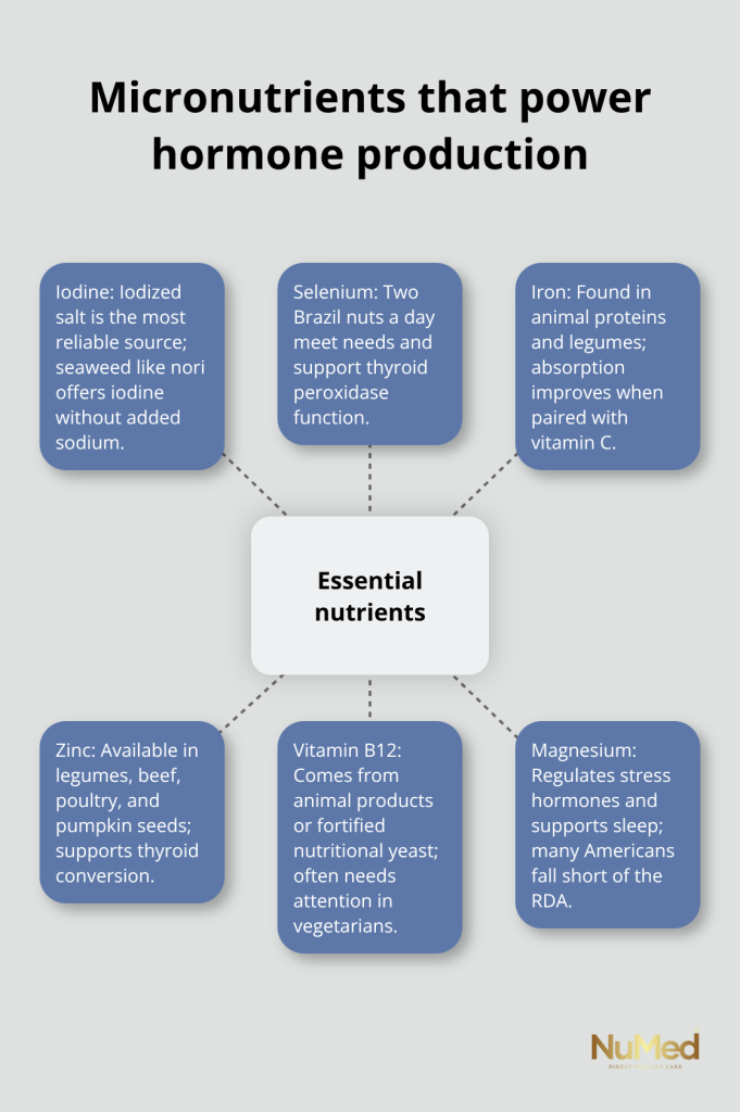 Your body cannot manufacture hormones without specific cofactors, yet most people consume these micronutrients in insufficient quantities. Iron, zinc, iodine, selenium, and vitamin B12 are non-negotiable for thyroid hormone production and conversion. Two Brazil nuts daily provide your entire daily selenium requirement, which is essential for thyroid peroxidase enzyme function. Iodized salt remains the most reliable iodine source, though seaweed products like nori sheets offer iodine without sodium concerns.