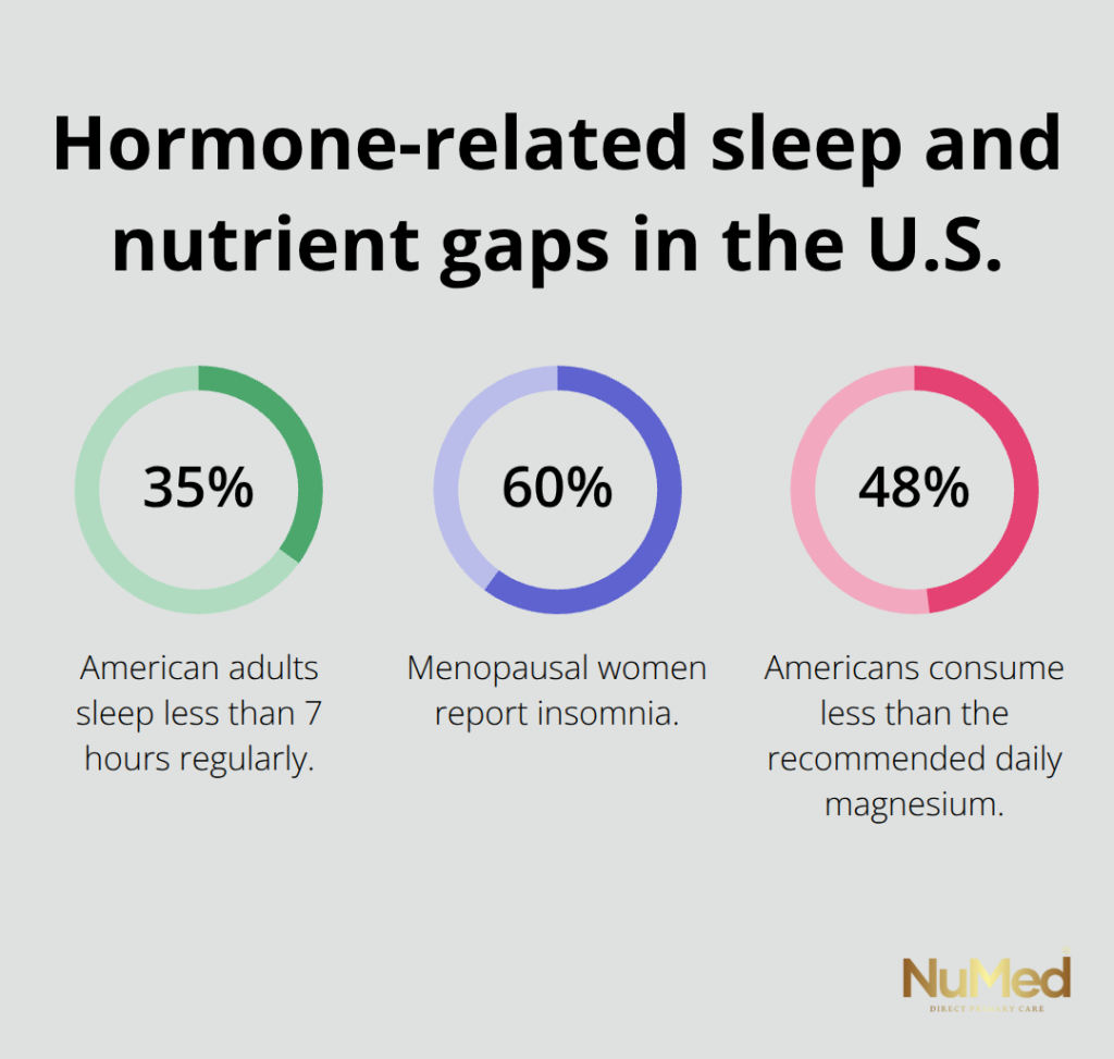 Magnesium regulates stress hormones through the HPA axis and supports sleep quality, yet 48% of Americans consume less than the recommended daily amount. Leafy greens, nuts, seeds, and whole grains supply magnesium, but supplementation at 200 to 300 milligrams daily often becomes necessary. Vitamin D influences sex hormone production and thyroid health, with the recommended daily allowance of 600 to 800 IU for adults, though many people require testing to determine if they need higher doses.